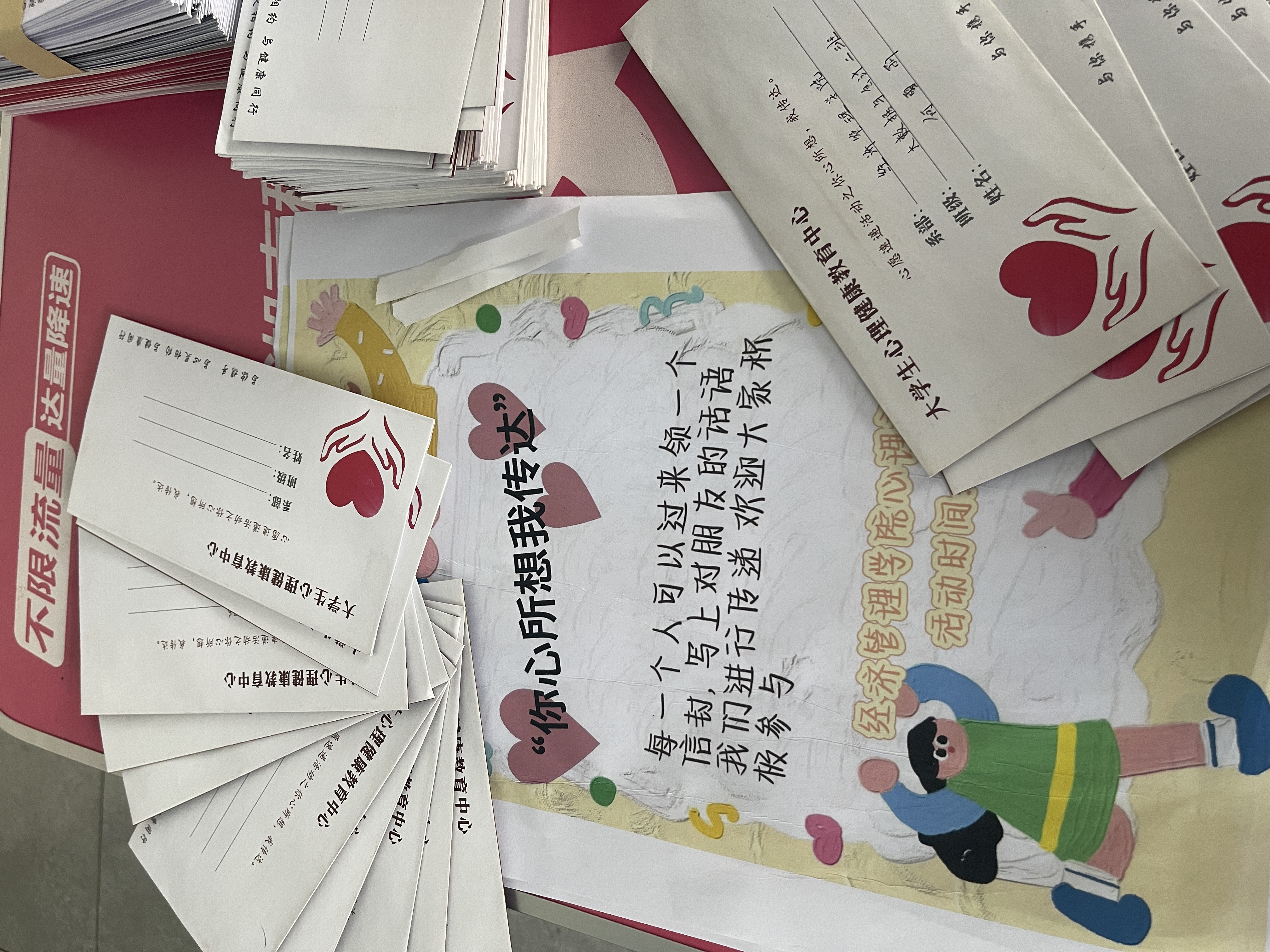 5月25日为我国“大学生心理健康日”,今年的主题为“五育润心,沐光同行”,旨在提醒大学生们“珍惜生命,关爱自己”。为迎接“5·25”心理健康日的到来,关爱我校学生心理健康,帮助学生释放情绪,经济管理学院于5月15日-5月25日在西苑食堂举办“你心所想我传达”书信活动。