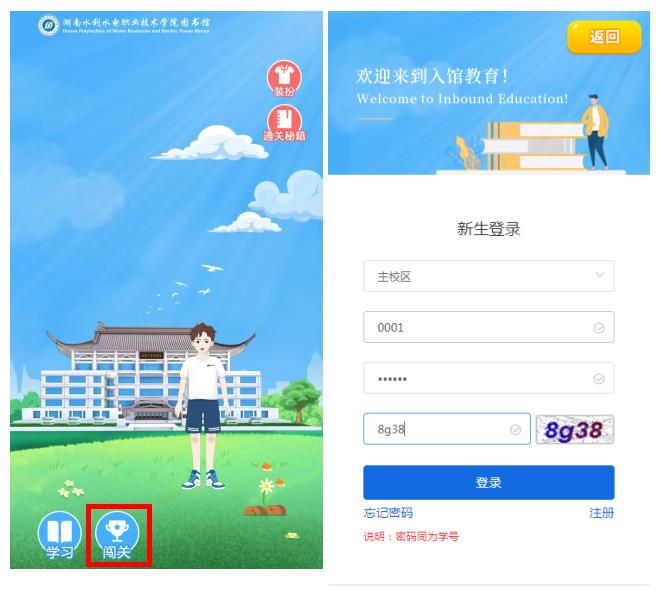 2.首先点选左下角的“闯关”,在弹窗中点选“新生登录”,输入学号和密码进行登录,初始密码是学号。