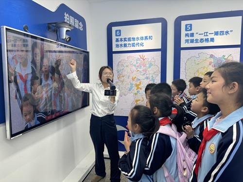 在湖南水情教育馆内,红帆水文化宣讲团的宣讲员们各展所长,深入浅出地为“红领巾”们揭秘水与文明的奥秘、治水奇迹的非凡、“江”“湖”关系的微妙。循循善诱地引导孩子们欣赏潇湘八景的诗意、雕版印刷艺术墙的古韵、《水兮湖湘》宣传大片的震撼。通过上秤测量人体含水量、乘舟饱览重大水利工程的壮美、积极贡献节水小妙招等互动环节,进一步强化孩子们的节水护水意识。