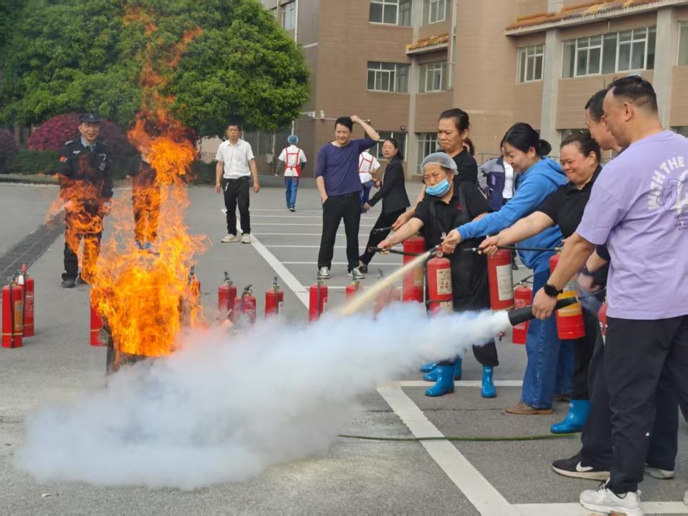 保卫部消防专员现场讲解干粉灭火器“提、拔、握、压”四步操作法,并针对油类、电器等不同火源扑救要点进行示范。参训人员在专业指导下,分组开展灭火器实操演练,直面模拟火场进行实战灭火。“看似简单的操作,实战中却要考虑风向和距离,这次培训很‘解渴’!”一名驻校餐饮员工感叹。
