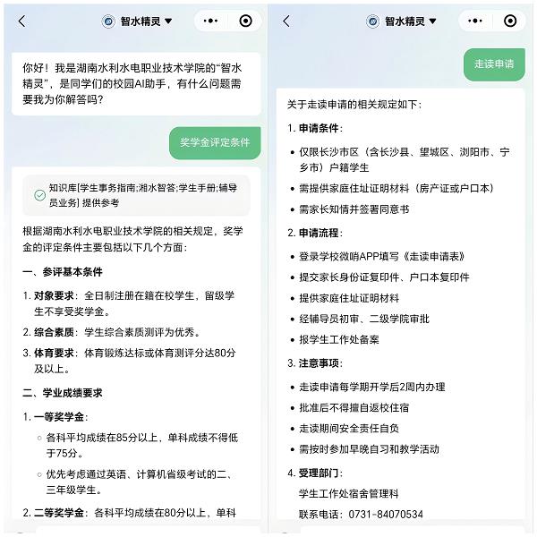 “我是2023级测绘工程技术专业的学生,我想知道毕业要求有哪些?”“我是大一学生,想了解学校奖学金评选的相关规定,并帮助我提供一些针对性的建议。”湖南水利水电职业技术学院大力推进数字技术在辅导员日常事务管理中的应用,依托学工微信公众号平台,正式推出“智水精灵”AI智能体,这一智能体通过腾讯元宝、Deepseek等技术支持,能够实现与学生进行智能对话,为他们提供业务办理咨询、学业与职业规划指导等多方面的帮助,不仅能为学生提供24小时咨询服务,也在一定程度上减轻了辅导员重复性的事务工作负担。