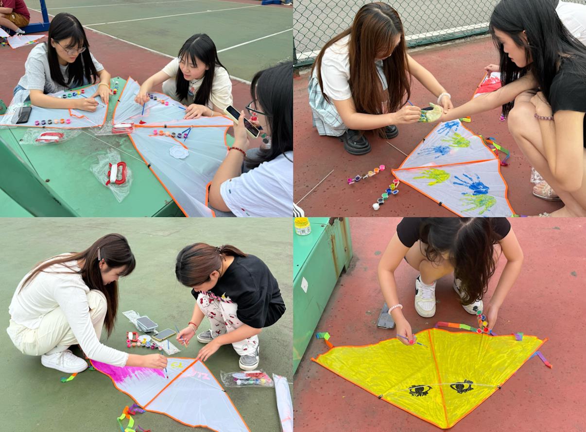 活动伊始,心理部成员现场示范风筝绘制技巧,从色彩搭配到图案设计,为学生们提供灵感参考。在自由创作环节,参与者手持空白风筝与绘画工具,或勾勒抽象线条,或描绘治愈图景——有的运用明快的暖色调表达对生活的热爱,有的以星空、飞鸟等意象寄托自由和向往。每个人都专注于自己的创作中,将压力转化为具象的艺术表达,在沉浸式创作中获得情绪疏解。