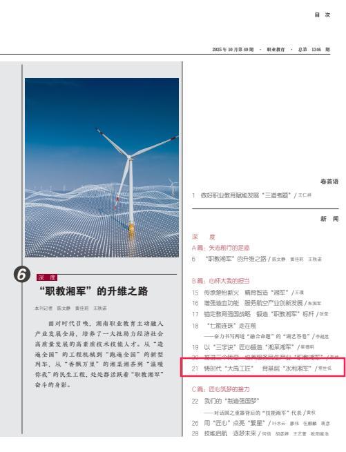 近日,我校党委书记常世名的署名文章《铸时代“大禹工匠” 育基层“水利湘军”》在《湖南教育·职业教育》杂志2025年第40期重磅栏目《“职教湘军”的升维之路》中公开发表。该文的刊发,是权威教育媒体对我校办学理念与人才培养成果的高度认可,全面彰显了学校在服务水利行业和区域经济社会发展中取得的显著成效。
