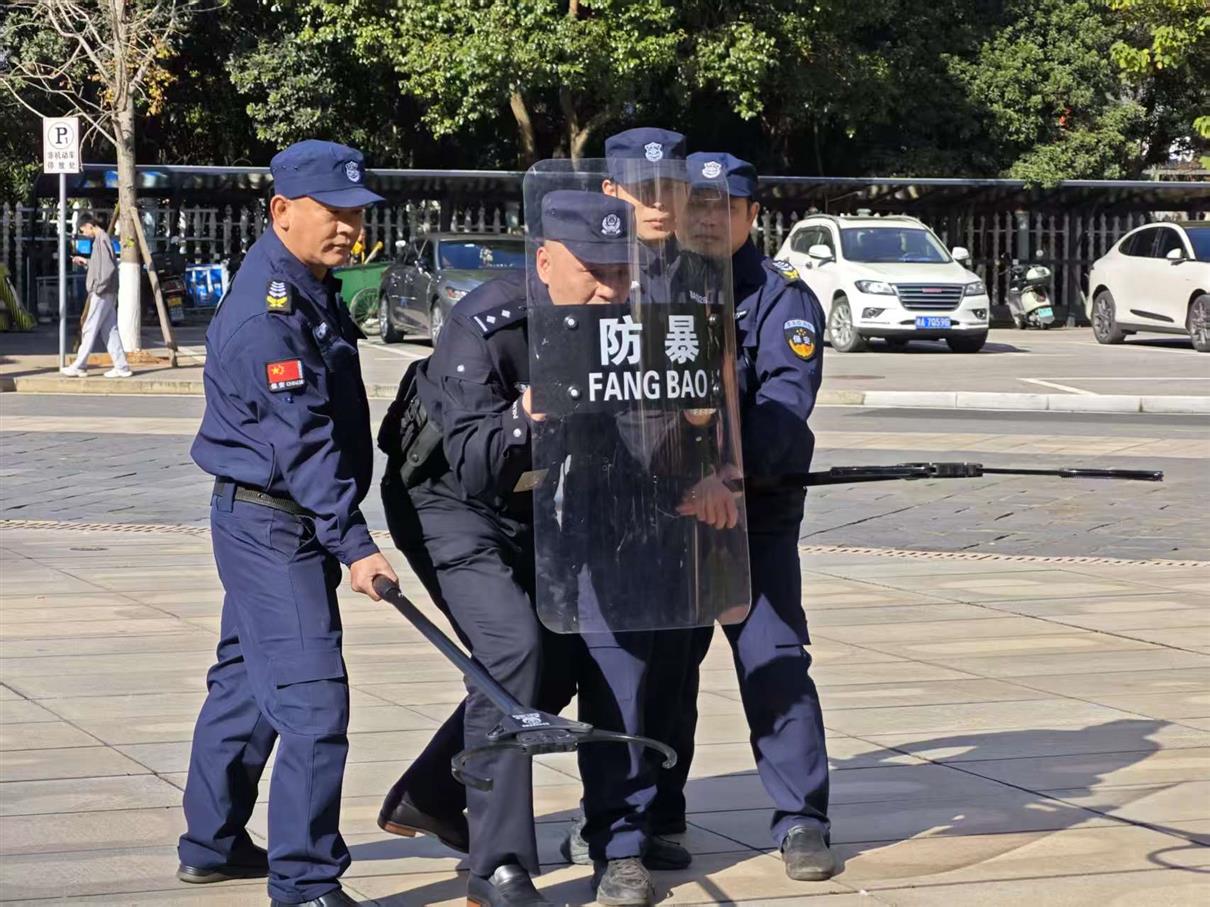 理论学习结束后,随即进入实战演练环节。安保人员以三人为一组,组成应急处置小队,按照预定方案投入演练。模拟场景中,一名“不法人员”企图闯入校园制造事端。面对突发情况,应急处置小队反应迅速、紧密配合,部分成员手持防护盾牌在前构筑防线,部分成员灵活运用防暴器材控制“不法人员”行动,整个演练过程紧张有序、分工明确、协同作战。