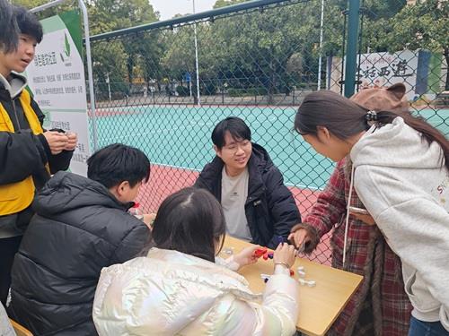 传统文化与青春活力在此交融共生。手工社团的“非遗漆扇雅艺”活动前,师生们凝神调配漆料、勾勒纹样,在指尖流转间领略传统漆艺的匠心之美,让非遗文化在校园焕发新生;思源文学社以“诗韵游园,文润心田”为主题,通过emoji猜古诗、成语接龙等趣味环节,让师生们在沉浸式答题中感受古典文学的魅力,筑牢文化自信。绿色建筑社团的鲁班锁体验区里,参与者在专人指导下解锁传统木工智慧,趣味问答区则以绿色建材知识为考点,在闯关互动中普及节能理念,践行绿色校园建设要求。