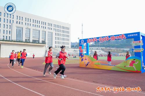 随着校长王玉成鸣枪发令,《中国青年志愿者之歌》的激昂旋律瞬间响起。志愿者们如离弦之箭冲出起点,沿着串联图书馆、教学楼、操场的校园闭环路线奋勇奔跑。赛道上,学子们步履矫健、笑容飞扬,用奔跑汇聚爱心,以脚步丈量担当。赛道旁,身着红色马甲的志愿者们有条不紊地递水补给,一句句“加油”温暖有力;护校队队员们坚守关键路段,目光专注地维护秩序、保障安全;途经的师生纷纷驻足瞩目,挥手呐喊助威,整个校园都沉浸在热血与温情交织的氛围中。