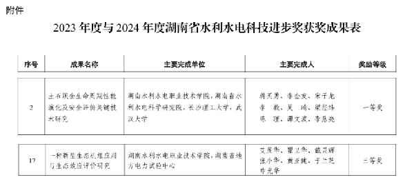 近日,湖南省水利学会发布2023年度与2024年度湖南省水利水电科技进步奖获奖名单。我校《土石坝全生命周期性能演化及安全评价关键技术研究》项目荣获湖南省水利水电科技进步奖一等奖,《一种新型生态机组应用与生态效应评价研究》项目荣获三等奖,实现了学校近年来在水利水电科技领域的新突破。